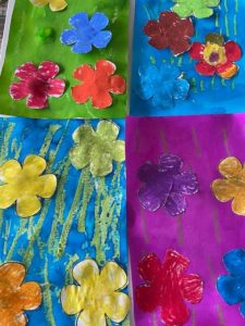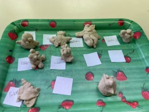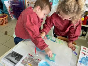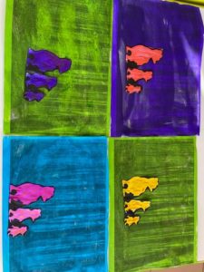 Nous avons aussi écouté le conte « Boucle d’or et les 3 ours« : nous avons joué sur les termes « petit, moyen, grand »; nous avons tracé des boucles et des 3 en MS et nous avons modelé un ours en pâte à sel. Nous avons aussi peint un tableau à la manière d’Andy Wharol.