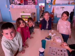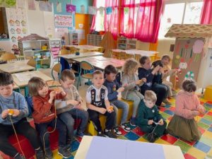 En GS, nous nous sommes lancés dans la confection de pompons en laine! Certains ont ajouté des yeux et un bec ou des oreilles de lapin. Enfin, nous avons cuisiné et goûté la recette du « cake aux petits pois et fêta de la Princesse au Petit Pois ». La semaine prochaine, nous cuisinerons « Le nid du Vilain Petit Canard ».