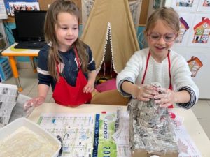 Nous avons concocté la recette des bonshommes en pain d’épice de la sorcière. Elle nous avait préparé de mauvais tours : la pâte collait aux doigts et deux bonshommes ont failli s’échapper !